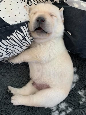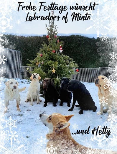 1 Tag später an Ostern hat Dena De Rose of Minto 10 Welpen zur Welt gebracht, ein Welpe wurde als Engel geboren. Der Vater ist Bebbe's Polle Vent v.d. Jabolkeshut. Die 5 gelben und 5 schwarzen Welpen sind wohlauf.